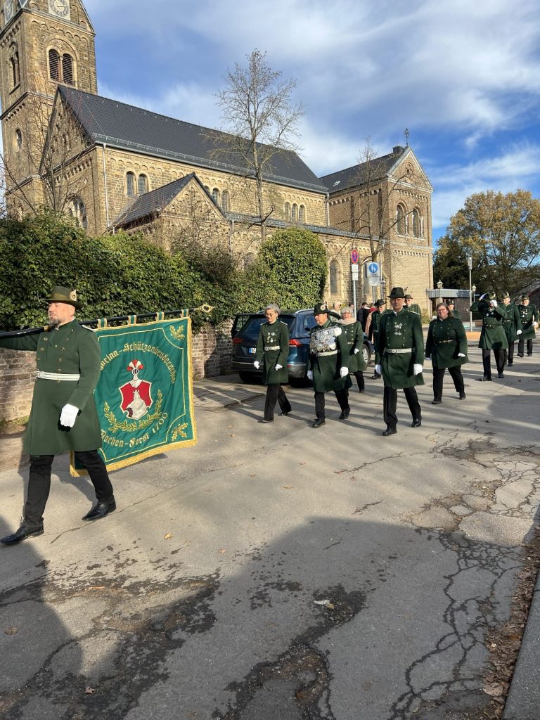 Bei unserem diesjährigen Patronatsfest wurden wir traditionell von unseren befreundeten Vereinen St. Sebastianus Hitfeld und St. Josef Schützen Aachen Forst begleitet. Musikalisch wurden wir von dem Musikcorps Zweifall.